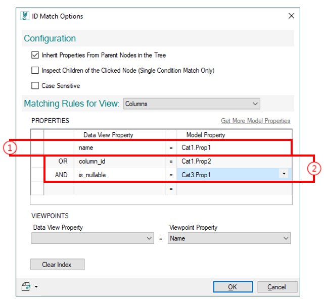When the 3D model is federated from multiple packages (Revit, Tekla, PDMS, Microstation etc.) the model property to use in the ID Match can have different name for each model. For that scenario, you can create complex ID Match, with multiple conditions and groups of conditions.