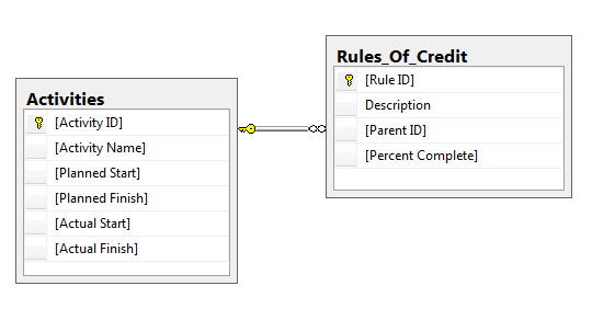 For the demonstration we will use a database with 2 tables, Activities and Rules_Of_Credit: