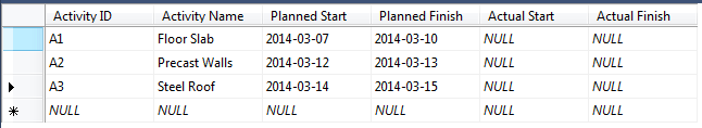 - The Activities table contains the activities, defined by an ID, name, planned start and finish dates. It contains 2 additional empty columns for users to report actual start and finish. The primary key (UID) of the table is the Activity ID column.